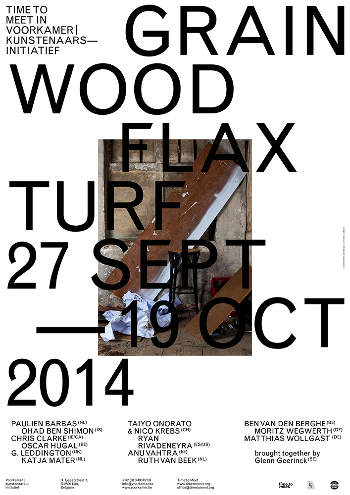 At the invitation of the artists initiative Voorkamer, Time to Meet lands in the provincial town of Lier and brings together 13 artists from different artistic and geographical backgrounds for the exhibition ‚Grain, Wood, Flax, Turf’. Since all of the contributors in this edition have participated in one or more previous projects with Time to Meet, this exhibition is also a reunion of artists whom been following each other for several years.